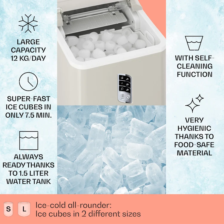 De Klarstein Albaron ijsblokjesmachine is de ideale partner voor elk feestje of warme zomerdag, waarbij gekoelde drankjes een must zijn. Of je nu een kleine samenkomst hebt of een groot feest organiseert, met deze machine zorg je ervoor dat je gasten altijd kunnen genieten van perfect gekoelde drankjes. Binnen 24 uur produceert de Albaron tot wel 12 kg aan kogelvormige ijsblokjes, in twee formaten naar keuze: groot of klein. Vul simpelweg het waterreservoir van 1,5 liter, zet de machine aan, en binnen slechts 9 minuten heb je de eerste lading ijs klaar. Voor kleinere ijsblokjes duurt het zelfs maar 7,5 minuten.
